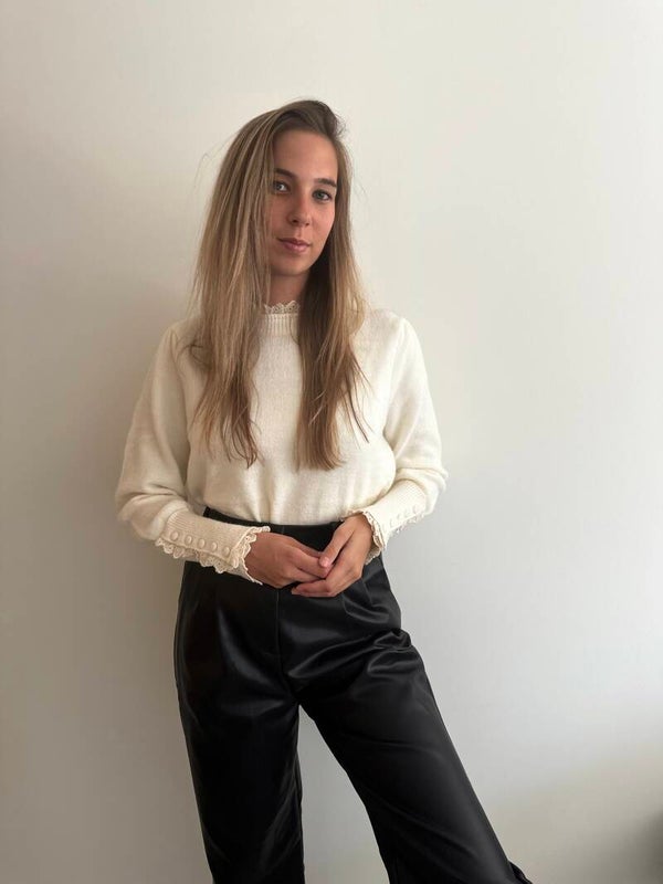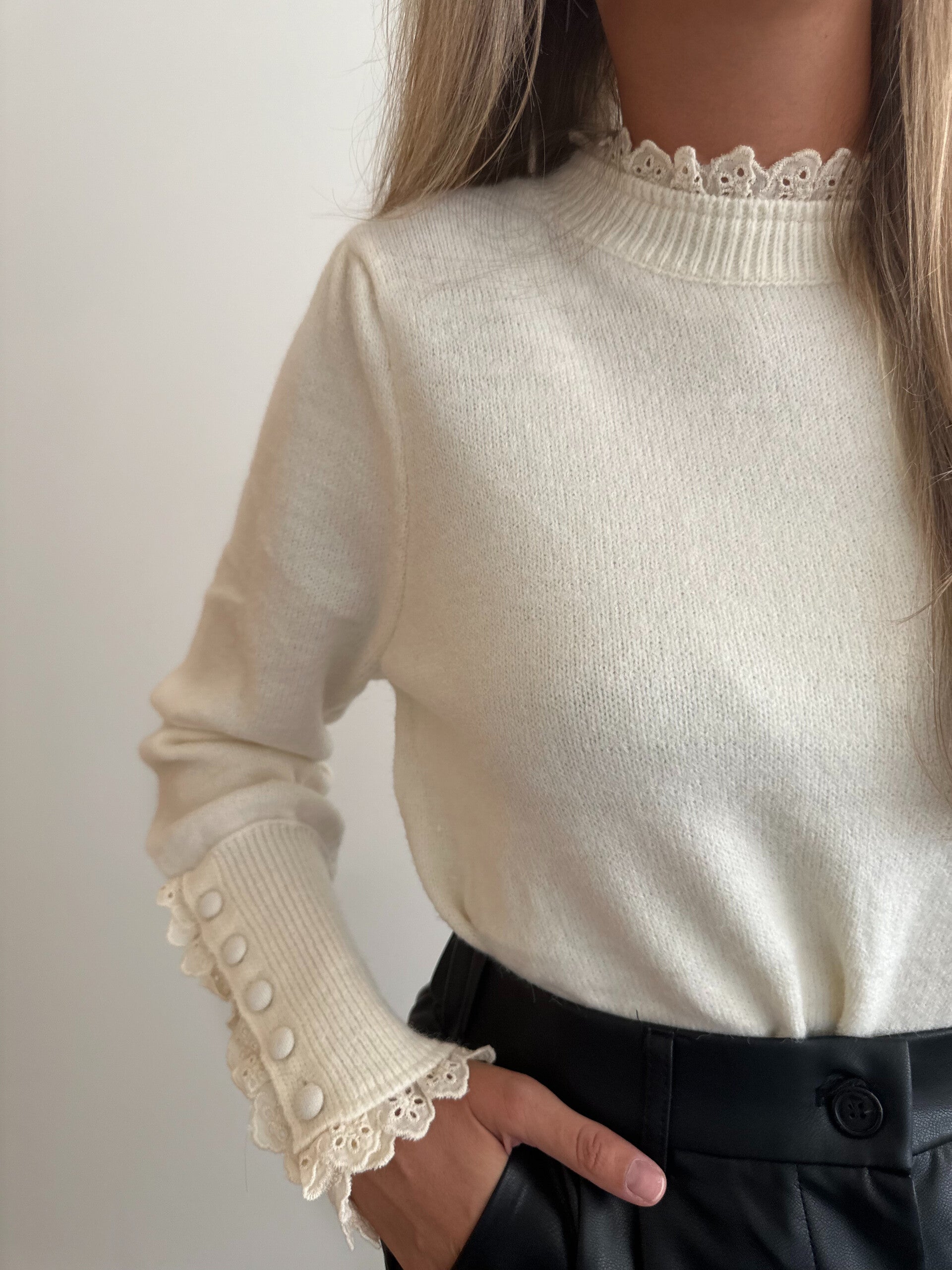 Dit truitje heeft een kanten afwerking thv de mouwen en kraag 🤍