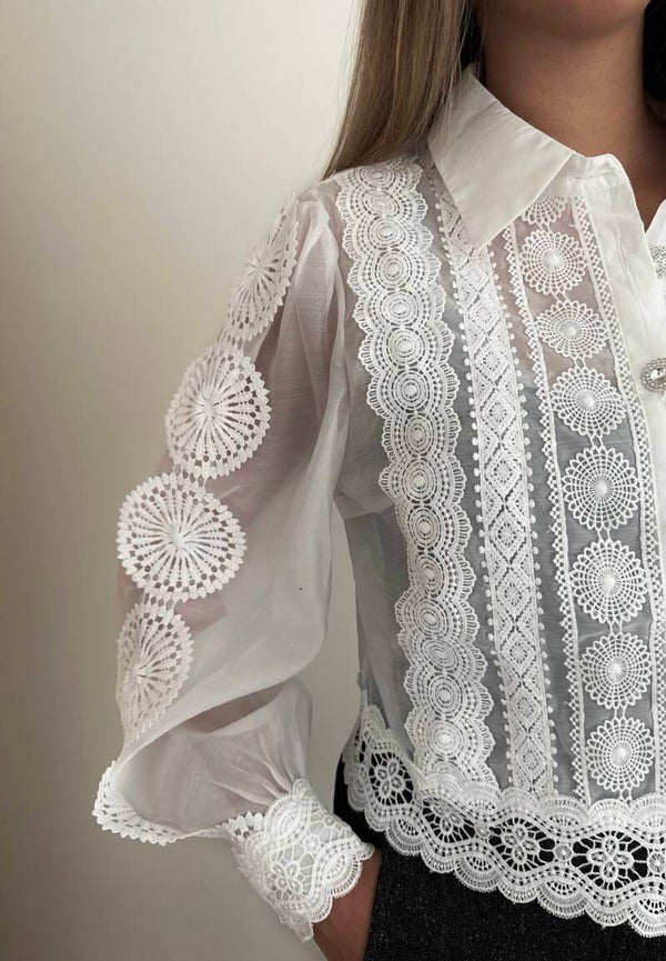De blouse heeft kanten details & is eerder een korter model. De blouse is afgewerkt met mooie glitterknopen. Wij raden aan om de blouse met de hand te wassen ✋🏽🧼