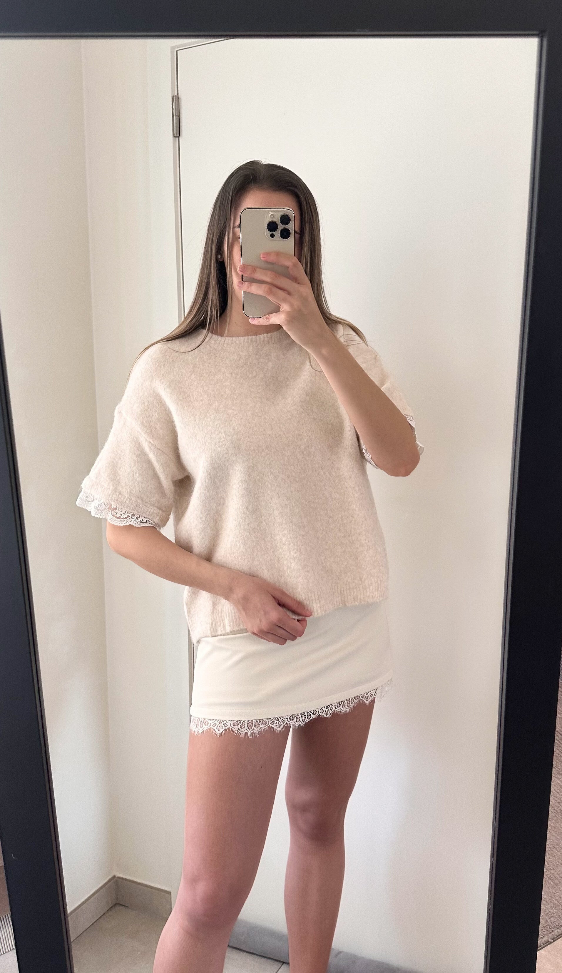 Deze pull/t-shirt is afgewerkt met kanten details aan de mouwen