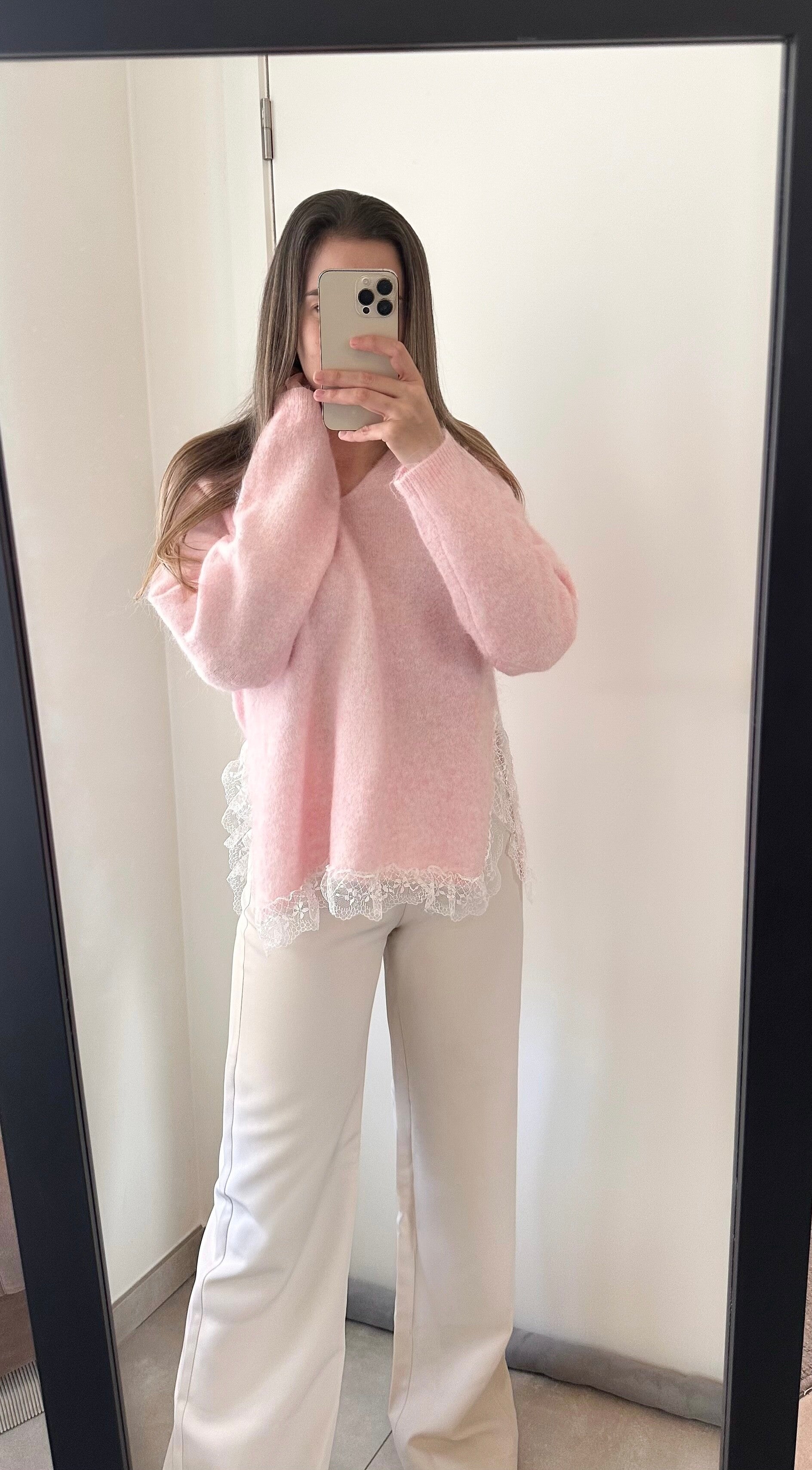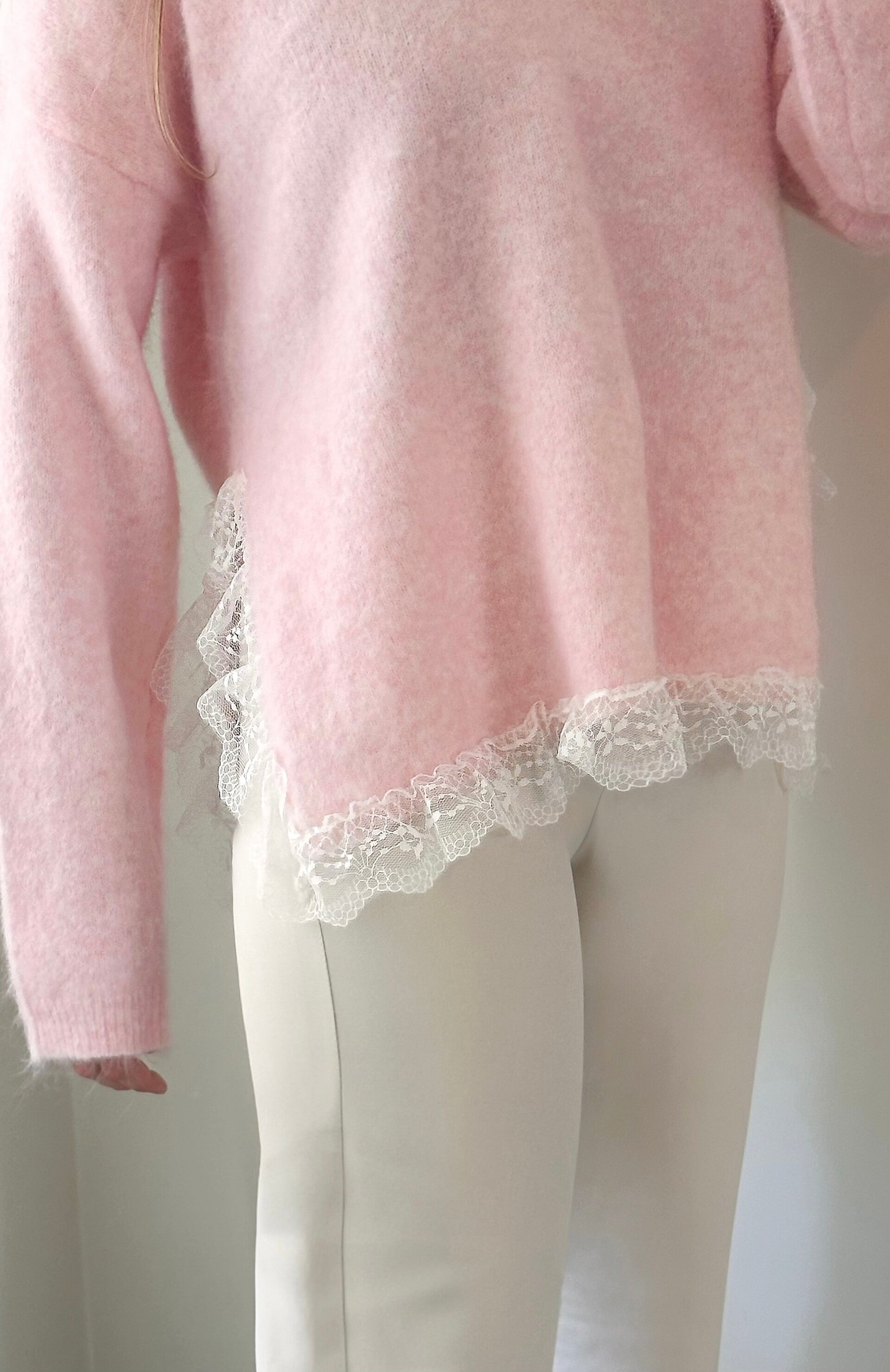 Deze sweater valt iets langer en iets meer oversized. Afgewerkt met leuke kanten details aan de onderzijde.