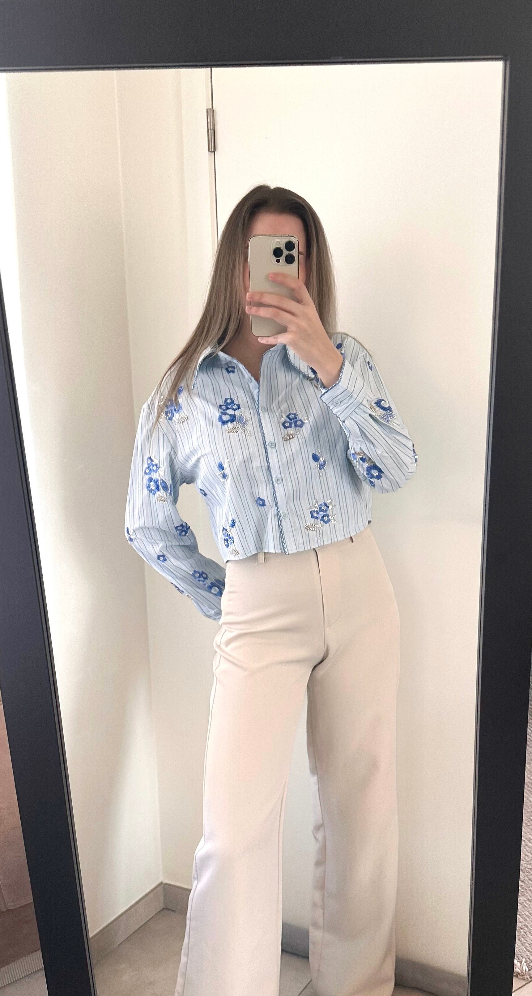 Deze blouse is afgewerkt met een verfijnd glitterbloemenpatroon. Deze blouse is een korter model, leuk te combineren op een broek met een hogere taille.